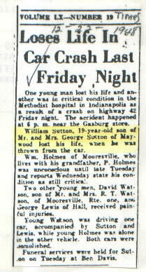 | Other | Age 19. Funeral at Ben Davis. Died in an auto accident on State Road 44 near Gasburg store. William Holmes of Mooresville was critically injured in the two-car crash. |