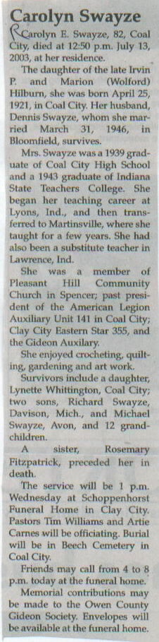 | Other | The daughter of the late Irvin P. and Marion (Wolford) Hilburn, she was born in Coal City. |