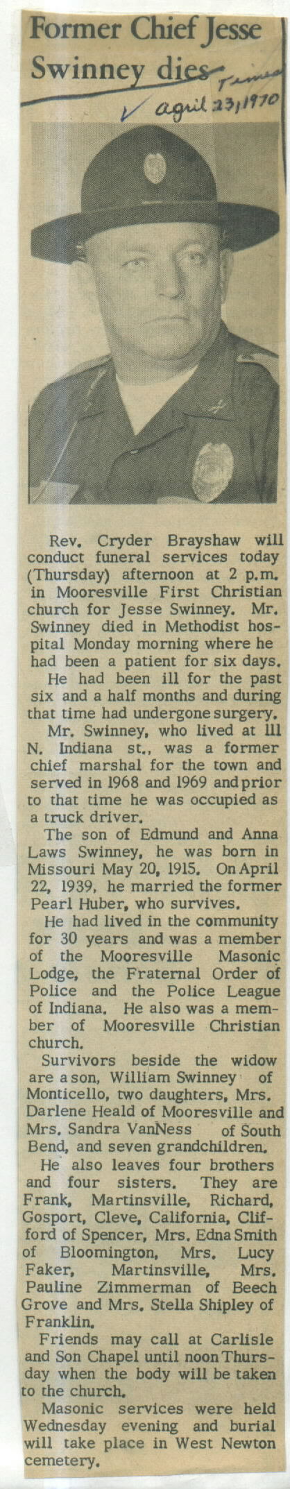 | Other | Age 54. Carlisle funeral at Christian Church. Buried West Newton cemetery. Parents: Edmund and Anna Laws Swinney. Mooresville police chief for several years. |