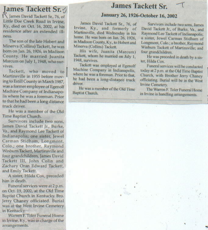 | Survived By | Widow; 2 sons, James David Tackett, Jr. and Raymond Lee Tackett; sister, Jewel Carman Stidham; brother, Raymond Winburn Tackett; grandchildren, James David Tackett III, John Colin and Zachary Oran Edward Tackett, and Emily Tackett. |