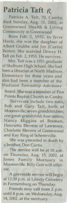 | Survived By | Spouse; 2 sons, Bob and Gary Taft; 7 grandchildren; one great-grandchild; 4 sisters, Nancy Higgins, Henrietta Blevens, Charlotte Blevens, and Kay Ring. |