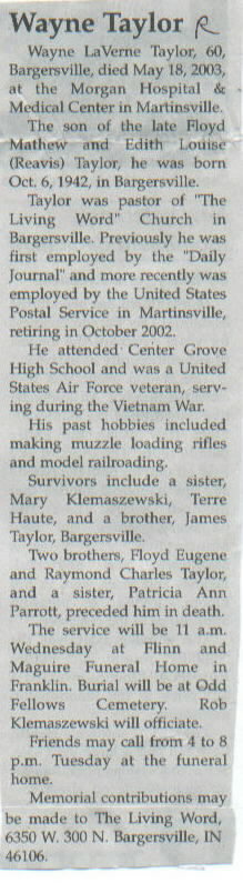 | Other | Age 60. The son of the late Floyd Mathew and Edith Louise (Reavis) Taylor, he was born in Bargersville. United States Air Force veteran, Vietnam War. |