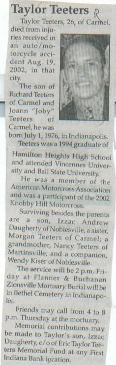 | Survived By | Parents, Richard Teeters and Joann "Joby" Teeters; son, Izzac Andrew Daugherty; sister, Morgan Teeters; grandmother, Nancy Teeters; companion, Wendy Kiser. |