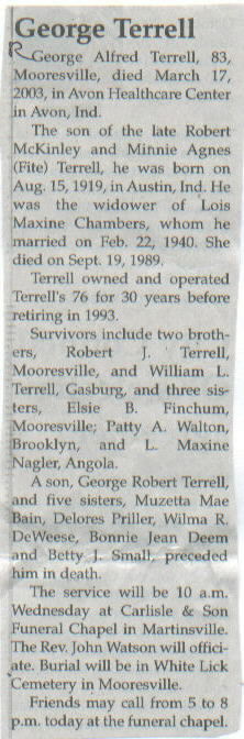 | Other | Age 83. The son of the late Robert McKinley and Minnie Agnes (Fite) Terrell, he was born in Austin, Ind. Preceded in death by a son, George Robert Terrell; and five sisters, Muzetta Mae Bain, Delores Priller, Wilma R. DeWeese, Bonnnie Jean Deem, and Betty J. Small. |