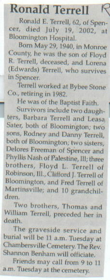 Survived By Mother, Lorena (Edwards) Terrell; 2 daughters, Barbara Terrell and Leasa Sater; 2 sons, Rodney and Danny Terrell; 2 sisters, Delores Freeman and Phyllis Nash; 3 brothers, Floyd L., Clifford J., and Fred Terrell; 10 grandchildren.