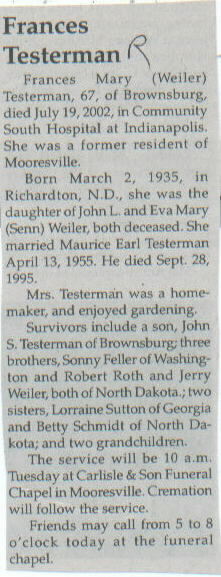| Survived By | Son, John S. Testerman; 3 brothers, Sonny Feller, Robert Roth, and Jerry Weiler; 2 sisters, Lorraine Sutton and Betty Schmidt; 2 grandchildren. |