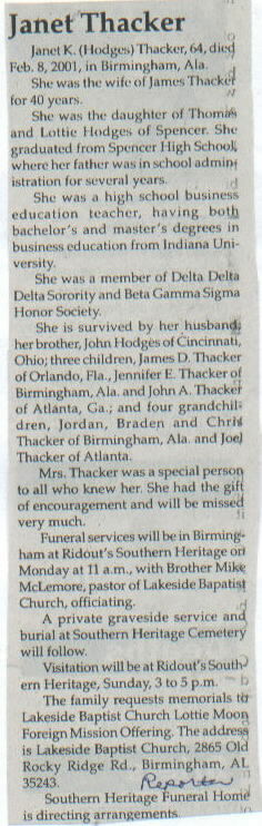 | Survived By | Spouse; brother, John Hodges; 3 children, James D., Jennifer E., and John A. Thacker; 4 grandchildren, Jordan, Braden, Chris, and Joel Thacker. |