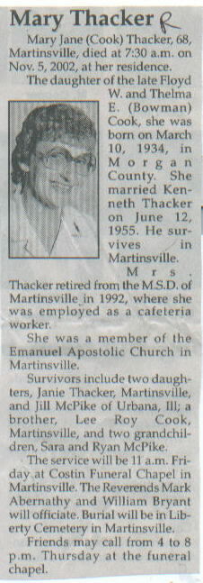 | Survived By | Spouse; 2 daughters, Janie Thacker and Jill McPike; brother, Lee Ry Cook; 2 grandchildren, Sara and Ryan McPike. |