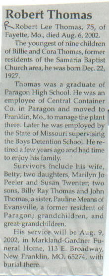 | Survived By | Widow; 2 daughters, Marilyn Jo Peeler and Susan Twenter; 2 sons, Billy Ray and John Thomas; sister, Pauline Means; grandchildren and great-grandchildren. |