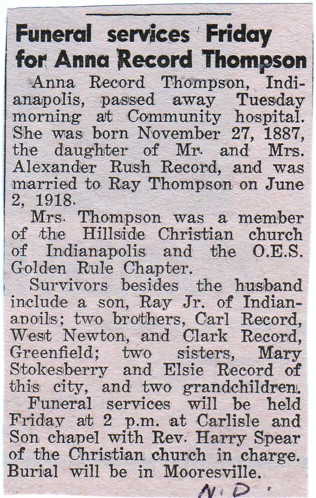 | Survived By | Husband; son, Ray, Jr.; brothers, Carl Record of West Newton and Clark Record of Greenfield; 2 sisters, Mrs. Claude (Mary) Stokesberry and Miss Elsie Record; 2 grandchildren. |