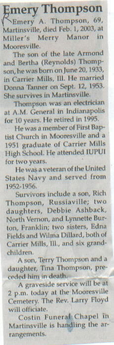 | Other | The son of the late Armond and Bertha (Reynolds) Thompson, he was born in Carrier Mills, Illinois. Veteran of the US Navy; served 1952-1956. A son, Terry Thompson, and a daughter, Tina Thompson, preceded him in death. |
