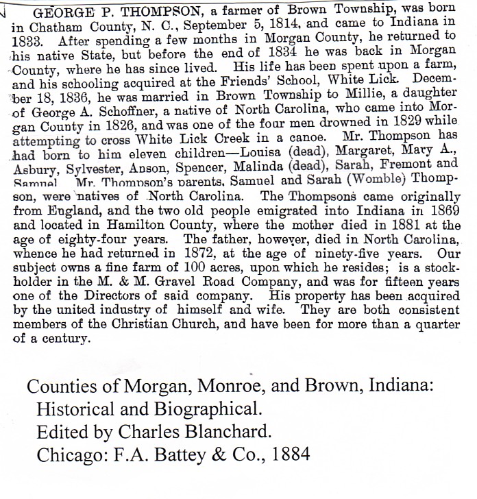 | Other | Age 75 years, 1 month, and 5 days. Died at his Mooresville home. Born: Pittsboro, Chatham Co., S.C.; son of Samuel and Sarah Womble Thompson. Came to Morgan Co. in 1833. Father of 11 children: 6 sons and 5 daughters. Preceded in death by one son and two daughters. |