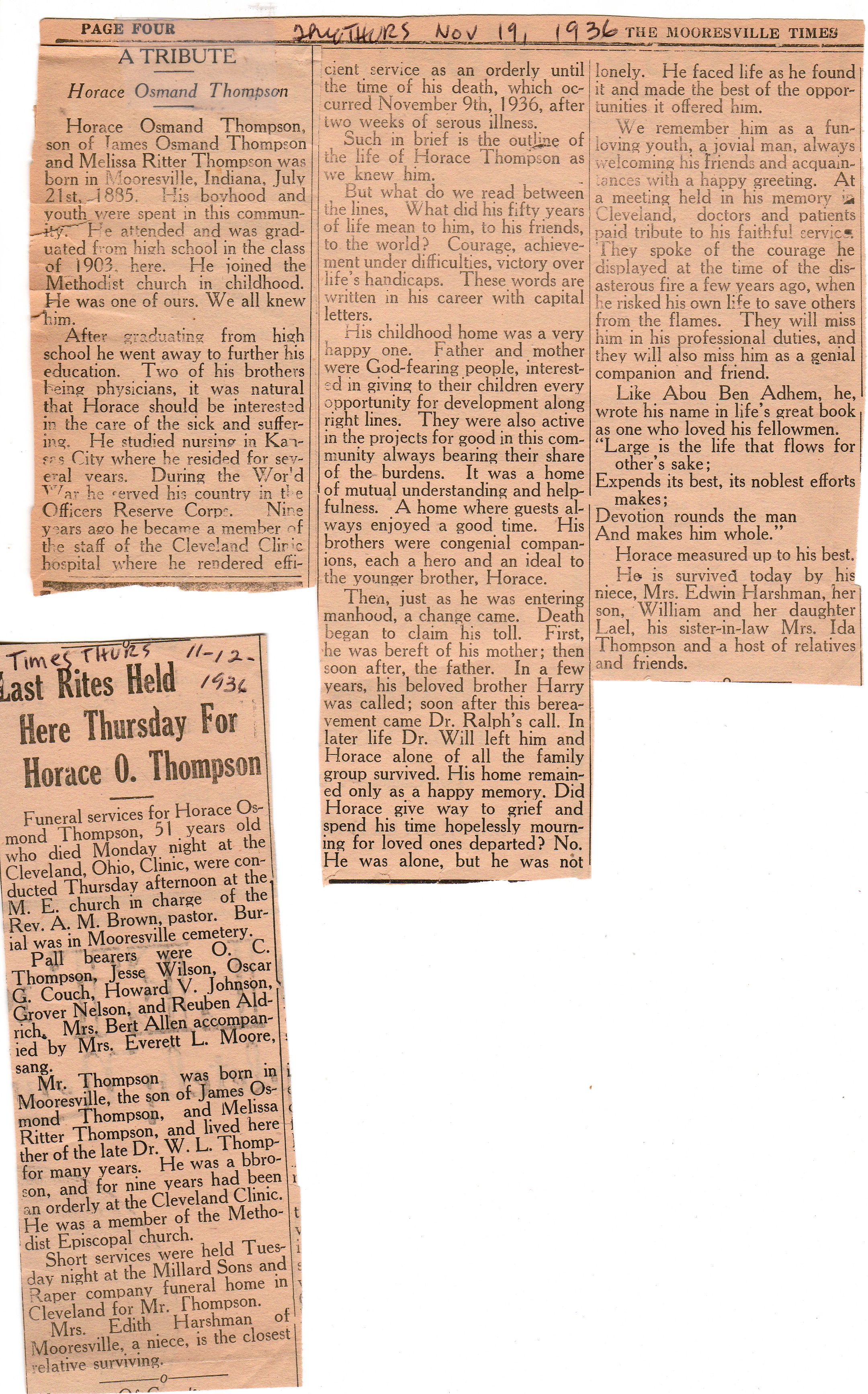 Other Funeral at Mooresville Methodist Church. Parents: James Osmond and Melissa Ritter Thompson. Graduate Mooresville HS 1903. Studied nursing. Lived in Kansas City for several years. Officer, Reserve Corps in World War I. On staff at Cleveland Clinic. Tombstone notes: "Pvt. trp a 1 sq cav dc ng WW I."
