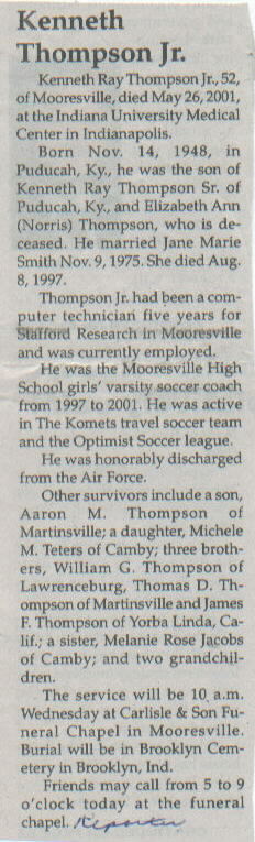 | Other | Born in Paducah, Ky., he was the son of Kenneth Ray Thompson, Sr. of Paducah, Ky., and Elizabeth Ann (Norris) Thompson, who is deceased. Honorably discharged from the US Air Force. |