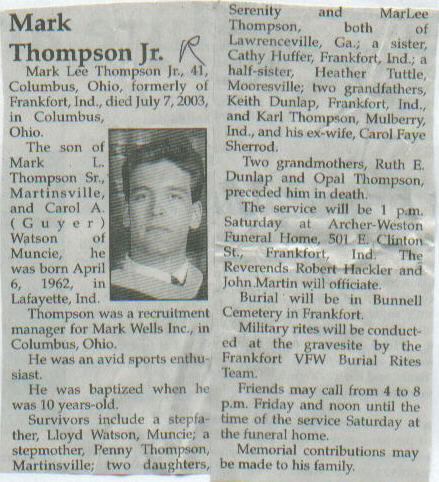 | Other | Age 41. Son of Mark L. Thompson, Sr., Martinsville, and Carol A. (Guyer) Watson of Muncie, he was born in Lafayette, Ind. |