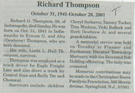 Other He was born in Indianapolis to Bynum G. and Alta (Dewbrew) Thompson, who are both deceased. Body was cremated.