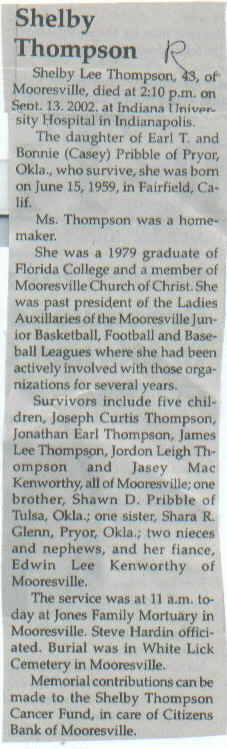 | Survived By | Five children, Joseph Curtis, Jonathan Earl, James Lee, Jordon Leigh Thompson, and Jasey Mac Kenworthy; brother, Shawn D. Pribble; sister, Shara R. Glenn; 2 nieces and nephews; fiance, Edwin Lee Kenworthy. |