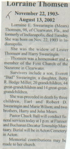 | Other | Preceded in death by three children, Earl and Robert D. Swearingin, and Marie Wilson; and two brothers, Harry and John Mars. |