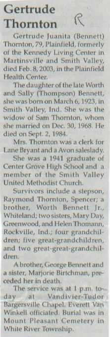 | Other | The daughter of the late Worth and Sally (Thompson) Bennett, she was born in Smith Valley, Ind. |