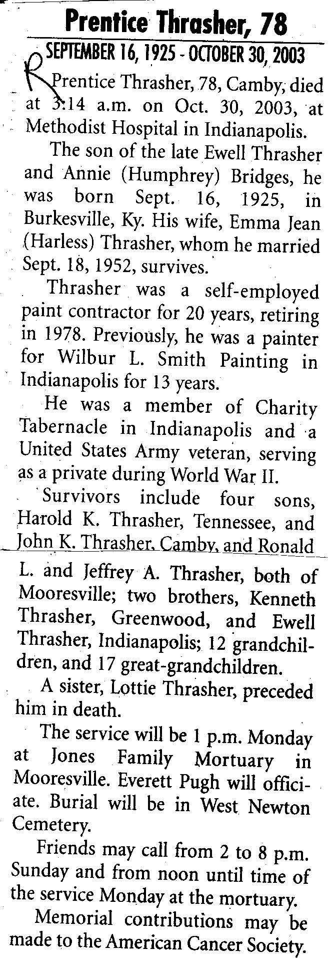 | Survived By | Wife; 4 sons, Harold K., John K., Ronald L., and Jeffrey A. Thrasher; 2 brothers, Kenneth and Ewell Thrasher; 12 grandchildren; 17 great-grandchildren. |
