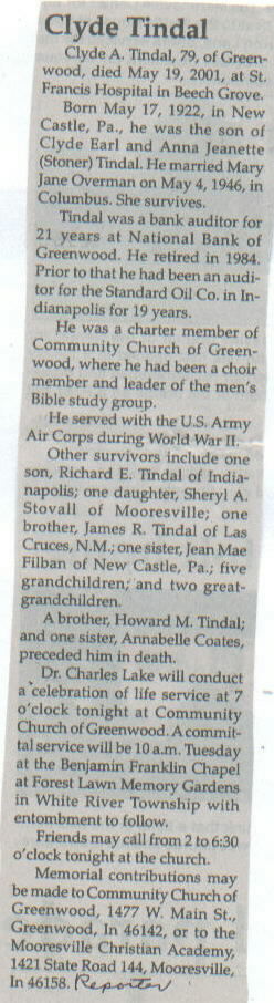 Other Born in New Castle, Pa., he was the son of Clyde Earl and Anna Jeanette (Stoner) Tindal. Served with the U.S. Army Air Corps during WW II.