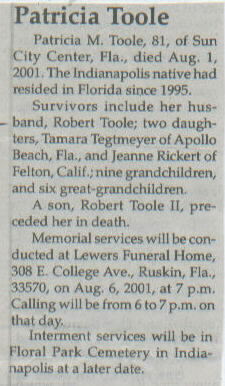 | Other | Age 81. A son, Robert Toole II, preceded her in death. |
