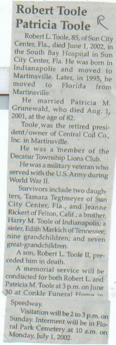 | Other | Veteran U.S. Army, WW II. A son, Robert L. Toole II, preceded him in death. |