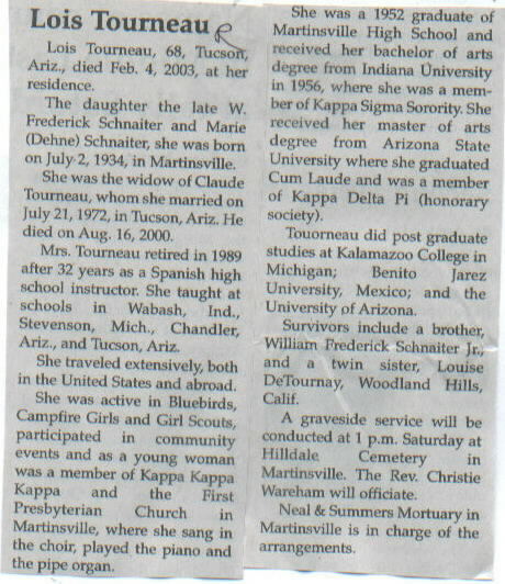 | Survived By | Brother, William Frederick Schnaiter, Jr.; twin sister, Louise DeTournay. |