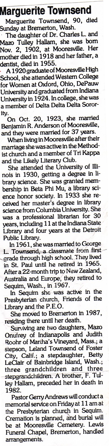 | Other | Age 90. Memorial at Presbyterian Church in Sequim, Washington. Lewis Funeral Chapel, Bremerton, Washington. Cremation at Forest Lawn cemetery, Indianapolis. Buried Mooresville Cemetery, in Tulley/Hallam family plot. Parents: Dr. Charles L. Hallam and Mazo Tulley Hallam. Born in Mooresville. Married Benjamin Anderson on Oct. 20, 1923. Preceded in death by brother, F. Tulley Hallam, who died in 1982. |