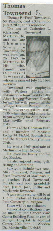 | Survived By | Widow; mother, Catherine L.(Garrison) Townsend; 2 sons, Mike and Scott Townsend; brother, Paul Townsend; 4 grandchildren, Jessica, Josh, Shelby, and Mackenzie Townsend. |