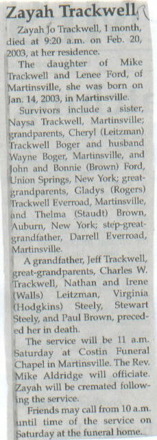 Survived By Parents, Mike Trackwell and Lenee Ford; sister, Naysa Trackwell; grandparents, Cheryl (Leitzman) Trackwell Boger and husband Wayne Boger, and John and Bonnie (Grown) Ford; great-grandparents, Gladys (Rogers) Trackwell Everroad and Thelma (Staudt) Brown; stepgreat-grandfather, Darrell Everroad.