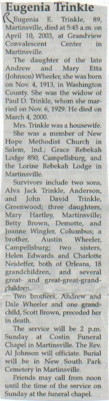| Survived By | Two sons, Alva Jack and John David Trinkle; 3 daughters, Mary Hartley, Betty Brown, and Joanne Wingler; brother, Austin Wheeler; 2 sisters, Helen Edwards and Charlotte Neideffer; 18 grandchildren; several great- and great-great-grandchildren. |
