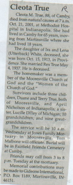 Survived By Three children, Duane and Terry True, and April Nicholson; sister, Lucille Dilley; 10 grandchildren; 9 great-grandchildren.