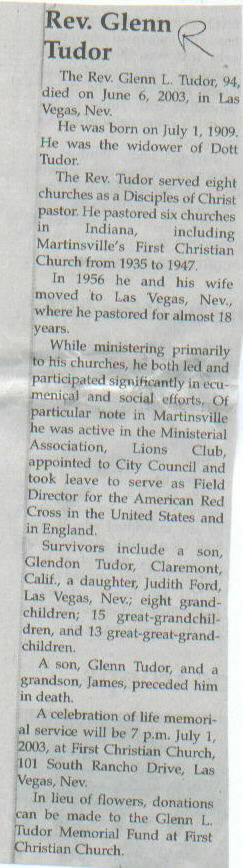 | Other | A son, Glenn Tudor, and a grandson, James, preceded him in death. A celebration of life memorial service will be held at First Christian Church, 101 South Rancho Drive, Las Vegas, Nevada. |