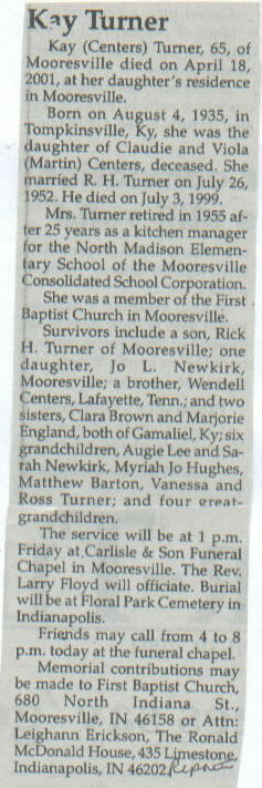 Survived By Son, Rick H. Turner; daughter, Jo L. Newkirk; brother, Wendell Centers; 2 sisters, Clara Brown and Marjorie England; 6 grandchildren, Augie Lee and Sarah Newkirk, Myriah Jo Hughes, Matthew Barton, and Vanessa and Ross Turner; 4 great-grandchildren.