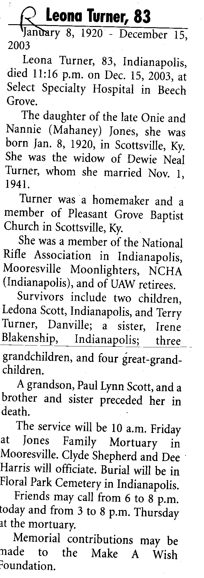 | Survived By | Two children, Ledona Scott and Terry Turner; sister, Irene Blakenship; 3 grandchildren; 4 great-grandchildren. |