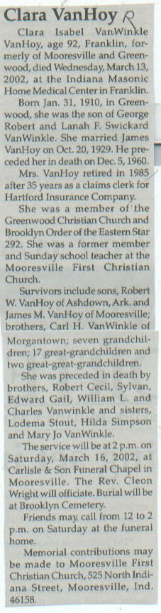 | Survived By | Sons, Robert W. and James M. Van Hoy; brother, Carl H. Van Winkle; 7 grandchildren; 17 great-grandchildren; 2 great-great-grandchildren. |
