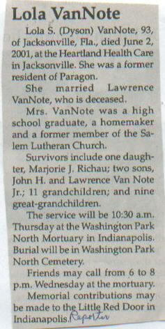 Survived By One daughter, Marjorie J. Richau; 2 sons, John H. and Lawrence Van Note; 11 grandchildren; 9 great-grandchildren.