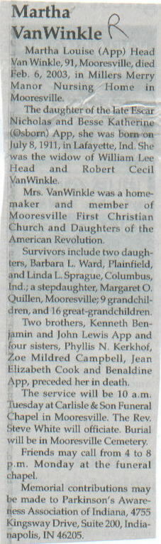 | Other | The daughter of the late Escar Nicholas and Besse Katherine (Osborn) App, she was born in Lafayette, Ind. Preceded in death by two brothers, Kenneth Benjamin and John Lewis App, and four sisters, Phyllis N. Kerkhof, Zoe Mildred Campbell, Jean Elizabeth Cook, and Benardine App. |