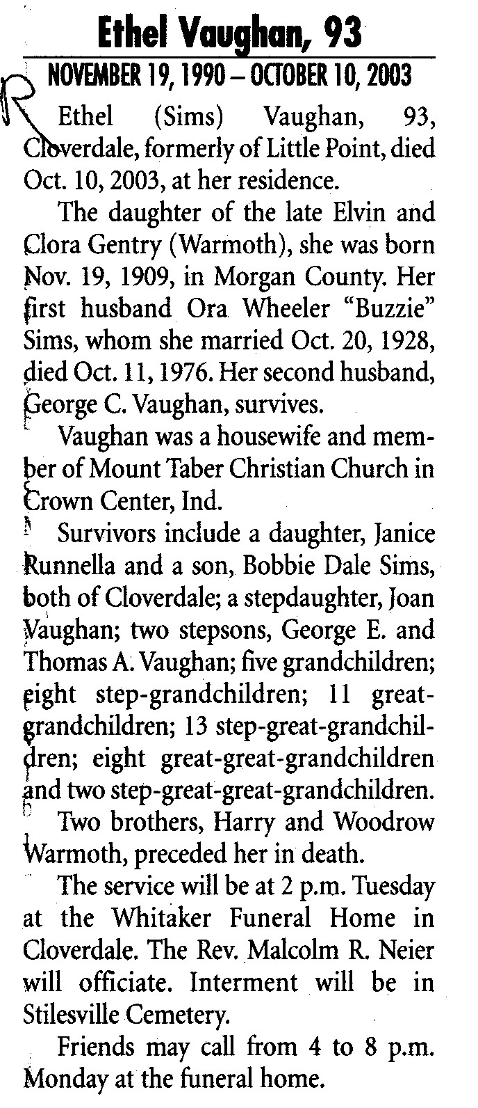 Survived By Husband; daughter, Janice Runnella; son, Bobbie Dale Sims; stepdaughter, Joan Vaughan; 2 stepsons, George E. and Thomas A. Vaughan; 5 grandchildren; 8 step-grandchildren; 11 great-grandchildren; 13 stepgreat-grandchildren; 8 great-great-grandchildren; 2 stepgreat-great-grandchildren.