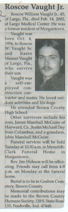 | Survived By | Parents, Roscoe W. Vaught, Sr. and Karen Masner Vaught; sons, James Marshall McGuire and Justin Michael Day; grandson, Jabin Marshall McGuire. |