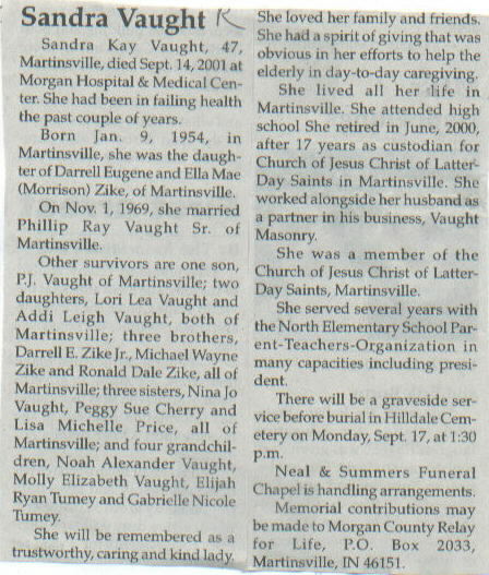 | Survived By | Spouse; parents; son, P. J. Vaught; 2 daughters, Lori Lea and Addi Leigh Vaught; 3 brothers, Darrell E., Jr., Michael Wayne, and Ronald Dale Zike; 3 sisters, Nina Jo Vaught, Peggy Sue Cherry, and Lisa Michelle Price; 4 grandchildren, Noah Alexander Vaught, Molly Elizabeth Vaught, Elijah Ryan Tumey, and Gabrielle Nicole Tumey. |