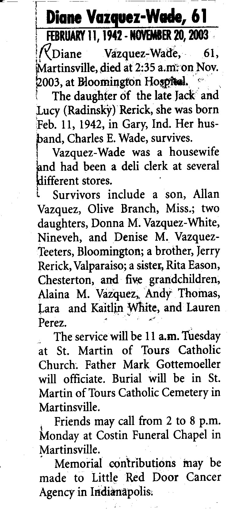Survived By Husband; one son, Allan Vazquez; 2 daughters, Donna M. Vazquez-White and Denise M. Vazquez-Teeters; one brother, Jerry Rerick; one sister, Rita Eason; 5 grandchildren.