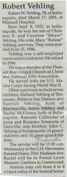 Other Born in Indianapolis, he was the son of Christian E. and Caroline "Meyer" Vehling. Served with the U.S. Marine Corps during WW II.