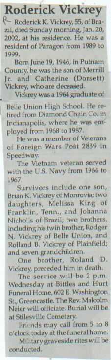 | Survived By | One son, Brian K. Vickrey; 2 daughters, Melissa King and Johanna Nicholls; 2 brothers, his twin brother, Rodger N., and Rolland B. Vickrey; 7 grandchildren. |