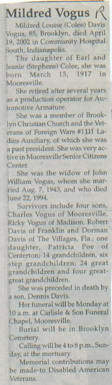 | Survived By | Four sons, Charles and Ricky Vogus, and Robert and Dorman Davis; daughter, Patricia Poe; 14 grandchildren; 6 stepgrandchildren; 24 great-grandchildren; 4 great-great-grandchildren. |