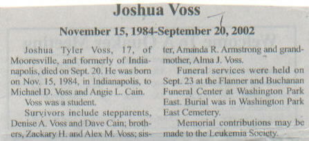 Survived By Parents, Michael D. Voss and Angie L. Cain; stepparents, Denise A. Voss and Dave Cain; brothers, Zackary H. and Alex M. Voss; sister, Amanda R. Armstrong; grandmother, Alma J. Voss.