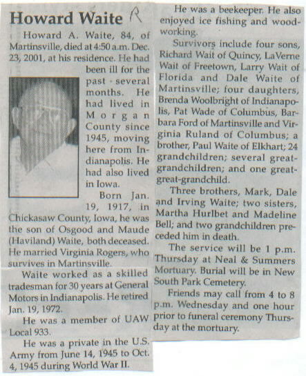 | Other | He was a private in the U.S. Army from June 14, 1945 to Oct. 4, 1945, during WW II. Born in Chickasaw County, Iowa, he was the son of Osgood and Maude (Haviland) Waite, both deceased. |