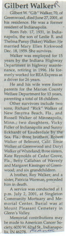 | Other | Born in Indianapolis, he was the son of Leslie R. and Thelma Pansy (Baker) Walker. |