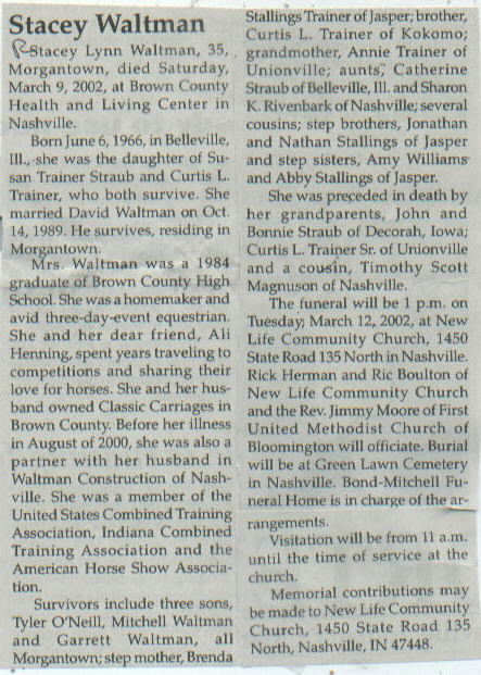 | Survived By | Spouse; parents, Susan Trainer Straub and Curtis L. Trainer; 3 sons, Tyler O Neill, Mitchell Waltman, and Garrett Waltman; stepmother, Brenda Stallings Trainer; brother, Curtis L. Trainer; grandmother, Annie Trainer; aunts, Catherine Straub and Sharon K. Rivenbark; several cousins; stepbrothers, Jonathan and Nathan Stallings; stepsisters, Amy Williams and Abby Stallings. |